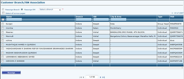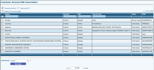 - Reassign RM: To Reassign Branch first Select Radio Button as Reassign Branch, Now select customer whose Branch is need to be reassigned. Now Pick a Branch from Below Dropdown and click on “Reassign”.