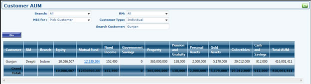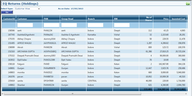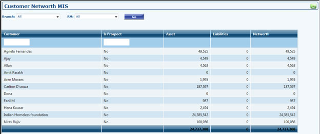 - Customer/Prospect Grid shows all the customers or prospect under all the RM's. Customer Grid is a Key Grid which can be used for many purposes. You can filter all the Customer or Prospects assigned to any particular RM by Assigned RM filter Dropdown. Is Prospect Filter shows you how many customers are real customer and how many are prospect customers. By applying Group filter on any name shows all the associated members of that particular group head.