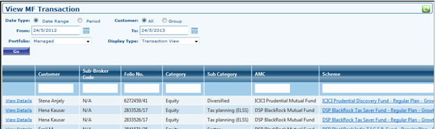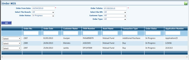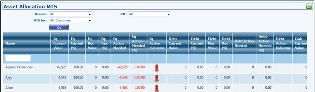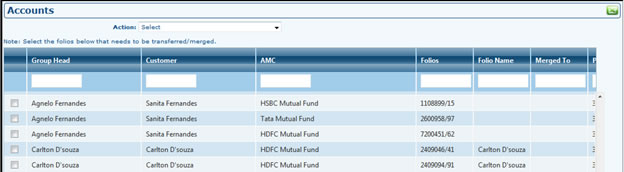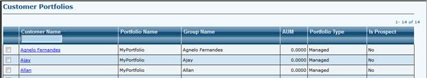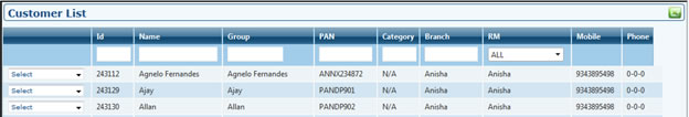 - From this grid you can also navigate to Customer's Module. By selecting options profile dashboard, portfolio dashboard, financial planning, alerts you can navigate to that customer's module. First column dropdown also has Delete option to be selected which will delete the selected customer if customer is not associated to any other customer or does not have any details in his profile or portfolio