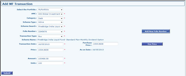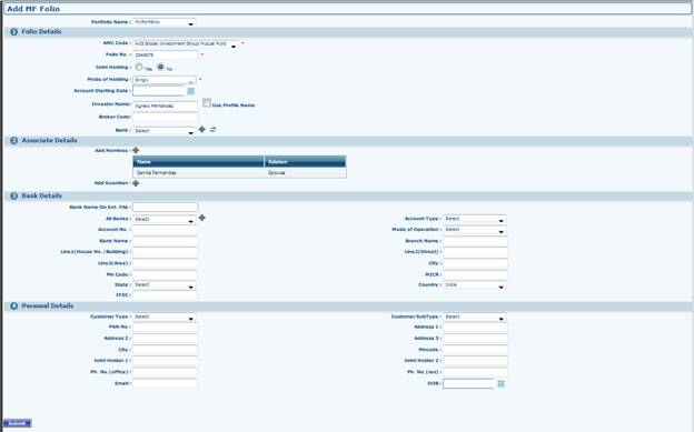 - Go to Portfolio Dashboard >> MF >> Add MF Folio. Fill the required fields and Submit