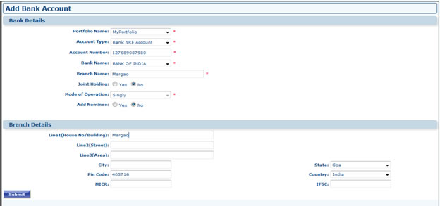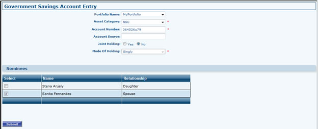 - Go to Portfolio Dashboard >> Govt. Savings >> Add Govt. Savings. Select Portfolio (If Any), Select Asset Category, Fill Account Number, If Account is Joint holding select the associate member from Join Holders Grid, Select the nominee from Grid (Make sure you have associate members then only Joint holders/Nominee Grid will appear). After Filling all the fields it will take you to next page