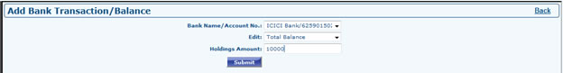 - Go to Profile Dashboard >> Bank Details >> Add Bank Transaction/Balance. Select the Account no. /Bank name and select one option then enter Holding Amount then Submit. If you fill the first one then only second one will appear.