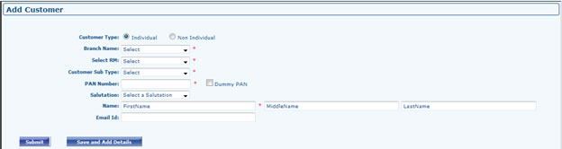 - Select customer type, Select Branch, Next dropdown will display all the RM's associated to selected Branch, Select Customer Sub type, PAN No., Name, Email id and click to Submit for Quick Add. If you want to add other Profile info also click to "Save and Add Details" Button. There you can fill Customer address, Proof, Bank Details Etc.