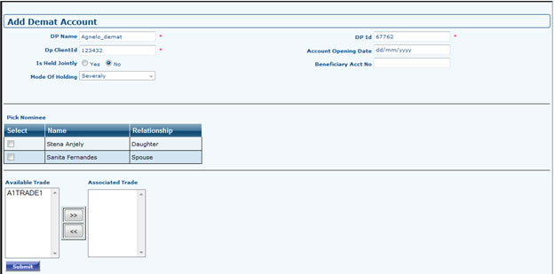 - Go to Profile Dashboard >> Demat Account Details >> Add Demat Account. Fill all required fields, Nominees and Joint Holder Grids will come only when "is jointly held" is selected as "Yes". Nominees & Joint Holder Grid will not appear if group account is not setup. Available Trade grid will show all trade done by customer which can be selected and associated with Demat account.
