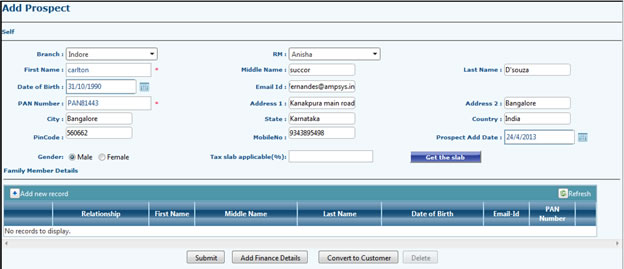 - Add Prospect option is available for RM logins. RM can add a Prospect, Fill all the details and click to Submit. After submit prospect will be visible in RM / Admin Customer Grid. Family Members / Associates will not be visible in Customer Grid.