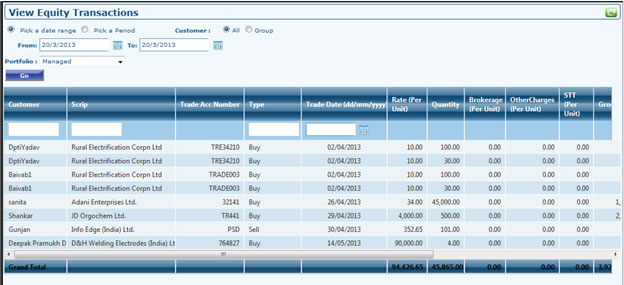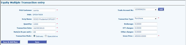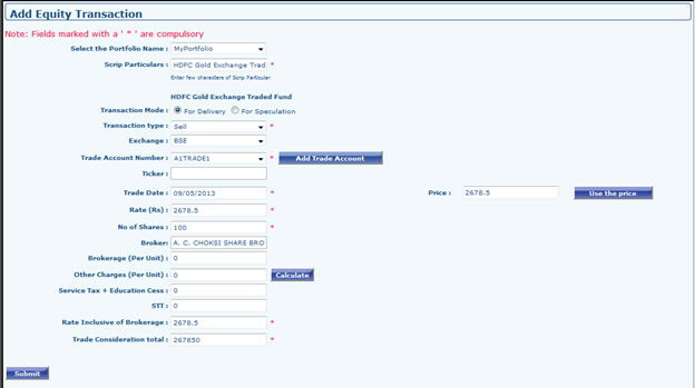 - Go to Portfolio Dashboard >> Equity >> Add Equity Transaction. Select Portfolio (if any), Type some letters of scrip name in "Scrip Particulars" field a dropdown will open select scrip (Please don't type scrip manually), Select transaction mode, Transaction Type (Purchase, Sell) , Exchange (BSE/NSE), Trade Account Number (Select trade account number from dropdown, in case you have not added trade account earlier click to Add Trade button to Add Trade Account), Ticker field will be automatically filled as soon as you selected Scrip Particulars, Select transaction date, Fill Rate, No. of shares (Broker field will be automatically filled as soon as you will select trade account number so no need to fill it manually), Brokerage, Other Charges after this click to Calculate Button Other Fields (Service Tax, STT, Rate inclusive of Brokerage, Trade consideration Total) will be auto-filled after calculation. After filling all fields click to submit.