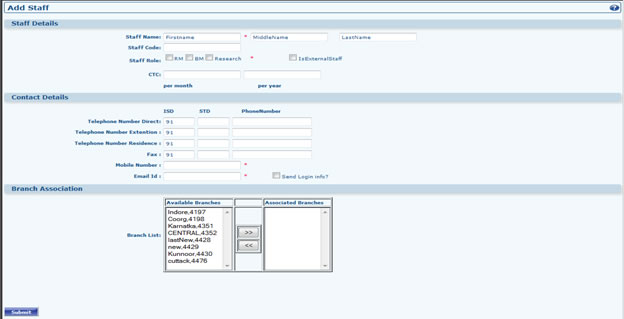- Fill all the required information in fields given in Add Staff Form. Here you can select Staff Role if he is Internal RM, Branch Manager, External RM and External Branch Manager.