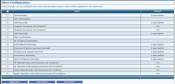 - "Alert Configuration Setup" Can be done by Admin which will be applied to all Customers. Birthday reminder, Maturity Date reminder, SIP Reminder, SIP Confirmation, Anniversary Reminder etc can be set from "Alert Configuration" Screen as shown below. To Edit any reminder just select the Alert from Screen and click to Edit Default and Change accordingly. After any change click on Apply Alert.