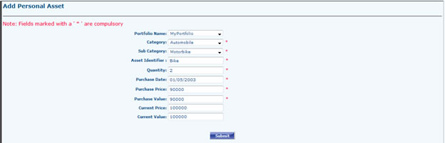 - Go to Portfolio Dashboard >> Personal Asset >> Add Personal AssetsSelect Portfolio Name (If Any), Select Category (Automobile, Furniture), Sub Category, Quantity etc and click to Submit. Submitted record can be Viewed / Edited from View Personal Asset Grid.