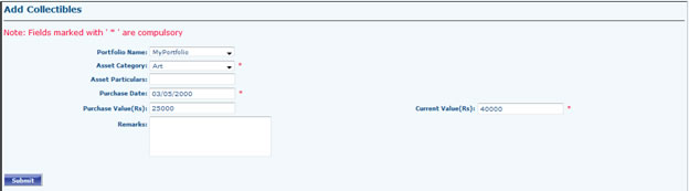 - Go to Portfolio Dashboard >> Collectibles >> Add Collectibles Select Portfolio (If Any), Select Asset Category (Art, Curios, Decorative, Plate Glasses, Collectibles Other, Personal, Yatch), Fill Asset Particulars & Fill other Details and Submit. Submitted records can be Viewed / Edited from Collectibles Grid.