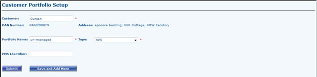 - Add New Portfolio: Select any customer name by typing customer name in Customer Field, PAN no. and Address associated with that costumer will be displayed below. Now give a name to new portfolio, Select Type of Portfolio, If its PMS, fill the PMS Identifier No. in below field and submit.