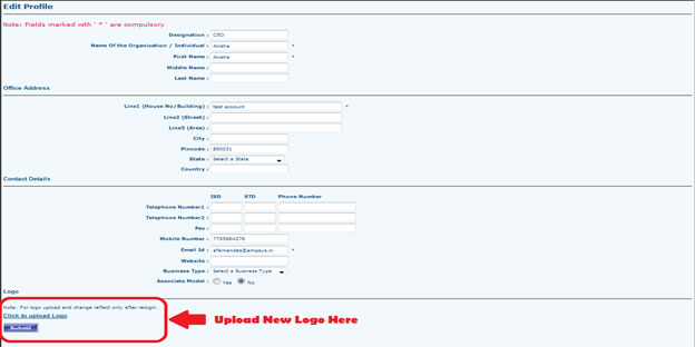 - Clicking on Edit profile will open a edit form there you can change or update organization profile information. You can change or upload a new logo by clicking on "Click To Change Logo" link. Select box will open, select the logo and click to Submit.