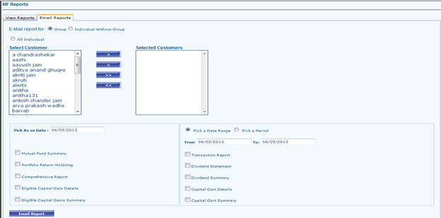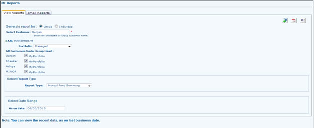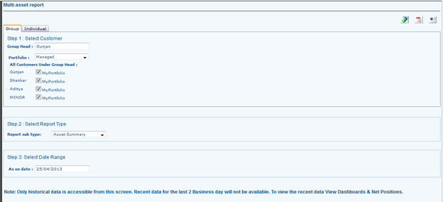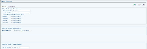 - Go to reports and select which report you want (MF, FP, Equity, Multi Assert) and select the portfolio, report type, Date. Select type in which format you want to see the report. If you want to save the reports select word or PDF