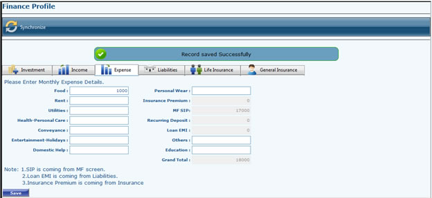 - Go to Finance >> Expense Details. Click edit and enter the amount for required fields and click to save. Entry can be edited anytime by Edit button. Insurance Premium is coming from Insurance Section, MF SIP value is coming from Monthly value of registered SIPs, Loan EMI value comes from Loan Section Monthly EMI Value and Recurring Deposit values comes from Fixed Income Recurring Deposit Entry.