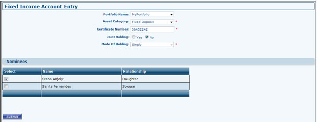 - Go to Portfolio Dashboard >> Fixed Income >> Add Fixed Income. Select Portfolio (If Any), Select Asset Category, Fill Certificate Number, If Account is Joint holding select the associate member from Join Holders Grid, Select the nominee from Grid (Make sure you have associate members then only Joint holders/Nominee Grid will appear). After Filling all the fields it will take you to next page.