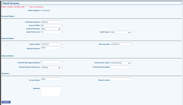 Fill All Required Fields and Submit. Submitted record can be Viewed / Edited from Fixed Income Grid.