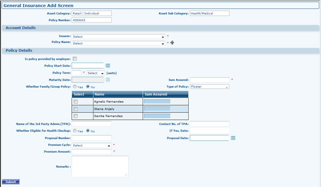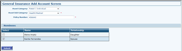 - Add General Insurance: Select Asset Category, then Select Asset Sub Category, fill policy number. It will take you to next page.