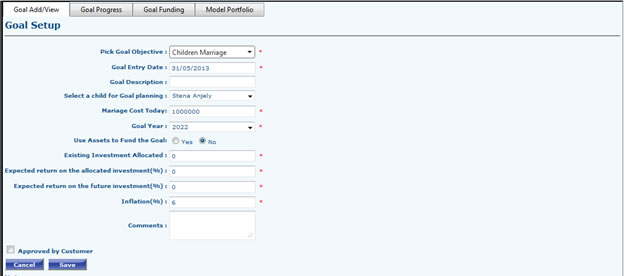 - Go to Financial planning >> Goal planning >> Goal setup. Fill the required fields then save.