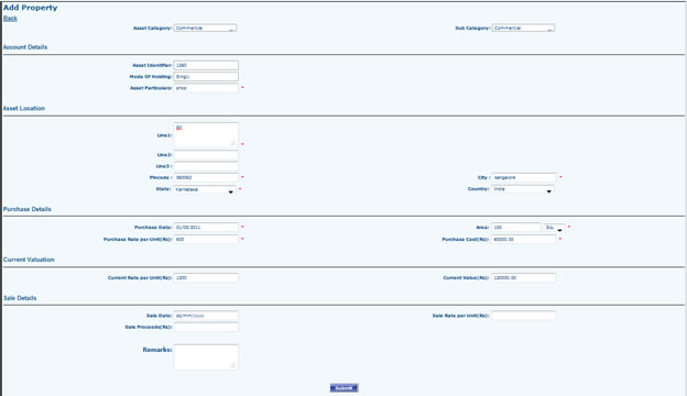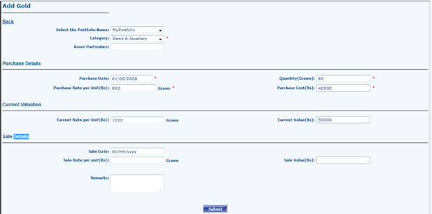 - Go to Portfolio Dashboard >> Gold Asset >> Add Gold Assets Select Portfolio (If Any), Category, Asset Particulars etc. And Submit. Submitted Records can be Viewed / Edited from View Gold Asset Grid.