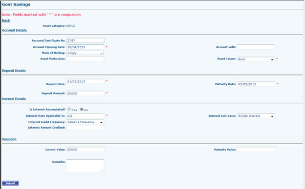 Fill All Required Fields and Submit. Submitted record can be Viewed / Edited from Govt Saving Grid.