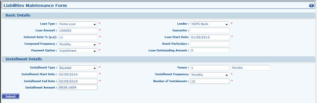 - Go to Liability Dashboard >> Add Liability. Select Loan Type (Home Loan, Auto Loan, Loan Against Property, Loan Against Shares, Personal Loan, Educational Loan, Business Loan, Loan Against Business Property), Select Lender, Fill Loan Amount, Interest Rate, Fill Guarantor Name and other Information and Click to Submit. If payment option is Lump sum then Installment Details Section won't be visible. Loan Outstanding Amount field is an automated field. After adding any entry can be Viewed or Edited from Liability Grid.