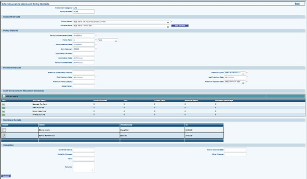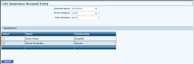 - Add Life Insurance: In first page select Portfolio Name (if you have other portfolio), Asset Category (Eg. Endowment Policy, Money back Policy, Term Policy, ULIP, Whole life Policy), Policy No., Now click to Submit. It will take you to next page.