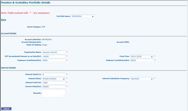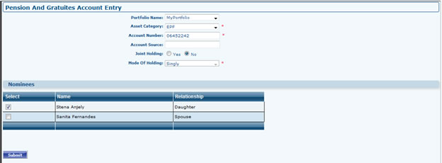 - Go to Portfolio Dashboard >> Pension And Gratuities >> Add Pension And Gratuities Select Portfolio (If Any), Select Asset Category, Fill Account Number, Account Source, If Account is Joint holding select the associate member from Join Holders Grid, Select the nominee from Grid (Make sure you have associate members then only Joint holders/Nominee Grid will appear). After Filling all the fields it will take you to next page.