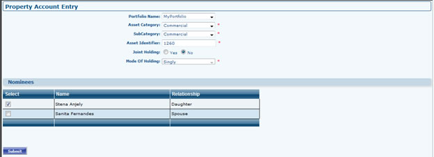 - Go to Portfolio Dashboard >> Property >> Add Property Select Portfolio (If Any), Select Asset Category, Sub Category, Asset Identifier, If Account is Joint holding select the associate member from Join Holders Grid, Select the nominee from Grid (Make sure you have associate members then only Joint holders/Nominee Grid will appear). After Filling all the fields it will take you to next page.