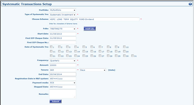- Go to Assets >> MF >> Register Systematic Schemes. Then fill the required fields and then submit the form