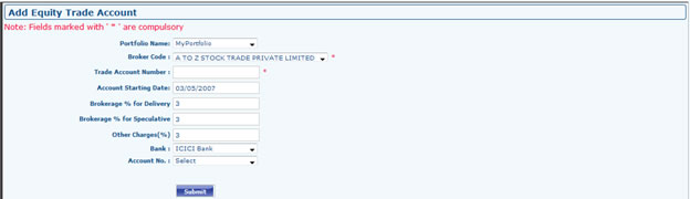 - Go to Portfolio Dashboard >> Equity >> Add Equity Account. Select Portfolio (if any), Broker Code from dropdown, Fill equity trade account number, Account starting date, brokerage % for delivery & speculative and other charges and click to Submit. Same can be Viewed/Edited from View Equity Account.